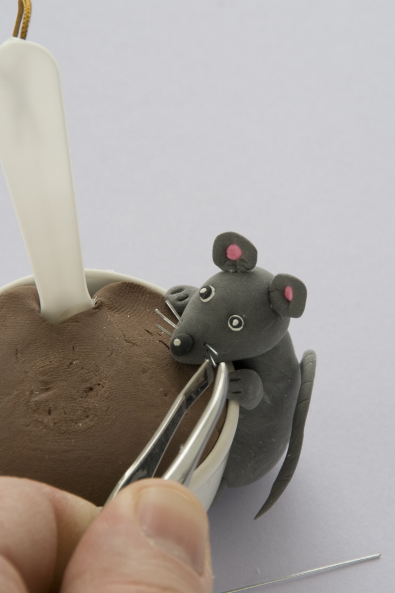 We used gray clay to make our mouse, but brown or white would also work. To create a smaller ornament we worked in a small scale, but you can make your creation in any size or shape you want.